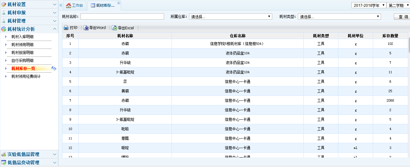 - 耗材查询,可按耗材入库、领用、报废、库存、自行采购等查询统计以及耗材经费情况统计查询耗材情况。